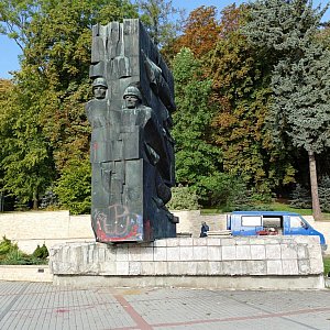 Ten, który do dzisiaj stoi na PlacuHarcerskim odbudowano w latach 70. Wtedy na murze obok monumentuwidniała tabliczka z napisem ?Pamięci Żołnierzy Armii Czerwonejpoległych w walkach o wyzwolenie Sanoka".