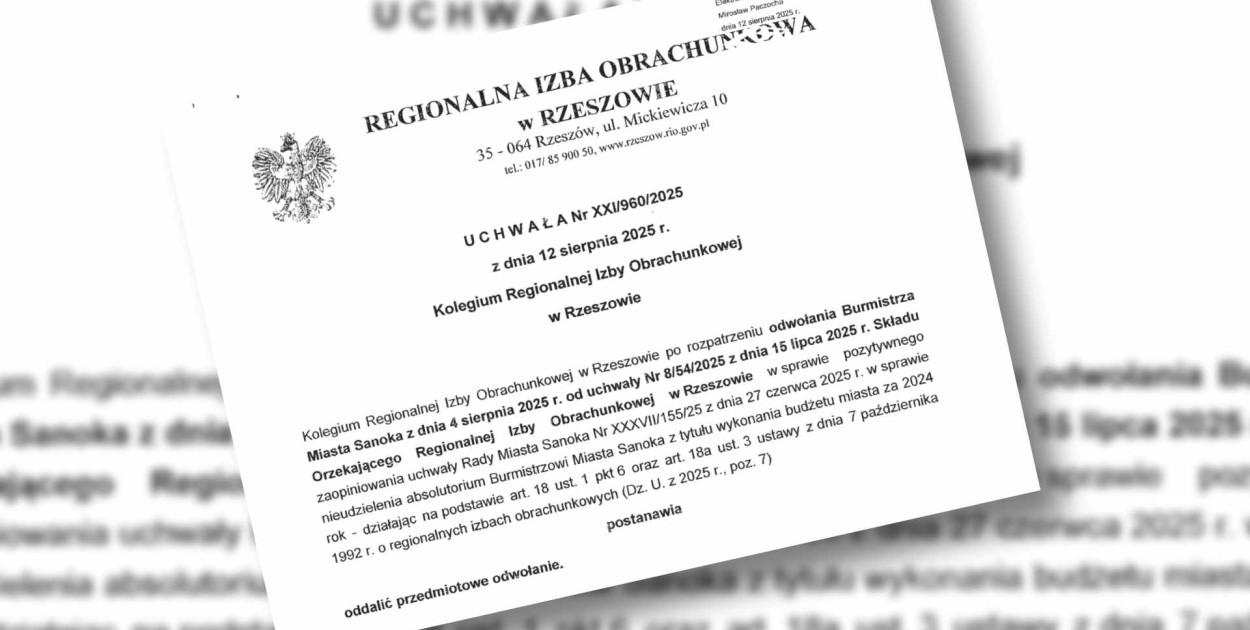 Regionalna Izba Obrachunkowa w Rzeszowie rozstrzygnęła wniosek Burmistrza Tomasza Matuszewskiego dotyczący uchwały Rady Miasta Sanoka w sprawie nieudzielenia absolutorium z tytułu wykonania budżetu za 2024 rok. Decyzja RIO jest jednoznaczna – wniosek burmistrza został w całości odrzucony, a sama uchwała Rady uznana za prawidłową i zgodną z przepisami prawa samorządowego.