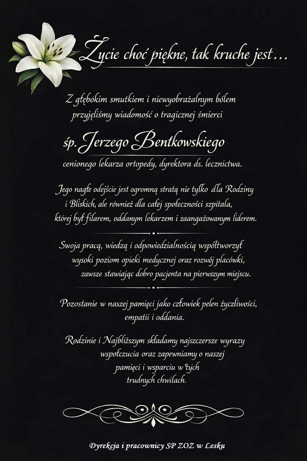 Śp. Jerzy Bentkowski był nie tylko doświadczonym lekarzem, ale również osobą, która przez lata współtworzyła funkcjonowanie leskiego szpitala. Jako dyrektor ds. lecznictwa odpowiadał za rozwój placówki i jakość opieki medycznej.