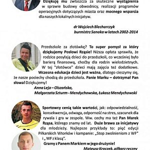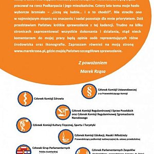- Kiedy w 2009 roku objąłem mandat posła na Sejm RP mówiłem, że będę ciężko pracował na rzecz Podkarpacia i jego mieszkańców. Cztery lata temu moje hasło wyborcze brzmiało - "Liczą się ludzie... i o to chodzi!". Nie straciło ono w najmniejszym stopniu na znaczeniu i nadal pozostaje dla mnie priorytetem. Dziś przedstawiam Państwu krótkie sprawozdanie z tej kadencji. Trudno na kilku stronicach zaprezentować wszystkie dokonania i działania, stąd niech komentarzem do mojej pracy będą opinie osób reprezentujących różne środowiska i ikonografie. Zapraszam również na moją stronę internetową www.marekrzasa.pl, gdzie znajdą Państwo szczegółowe sprawozdanie. - mówi Marek Rząsa, poseł na Sejm Rzeczypospolitej Polskiej .